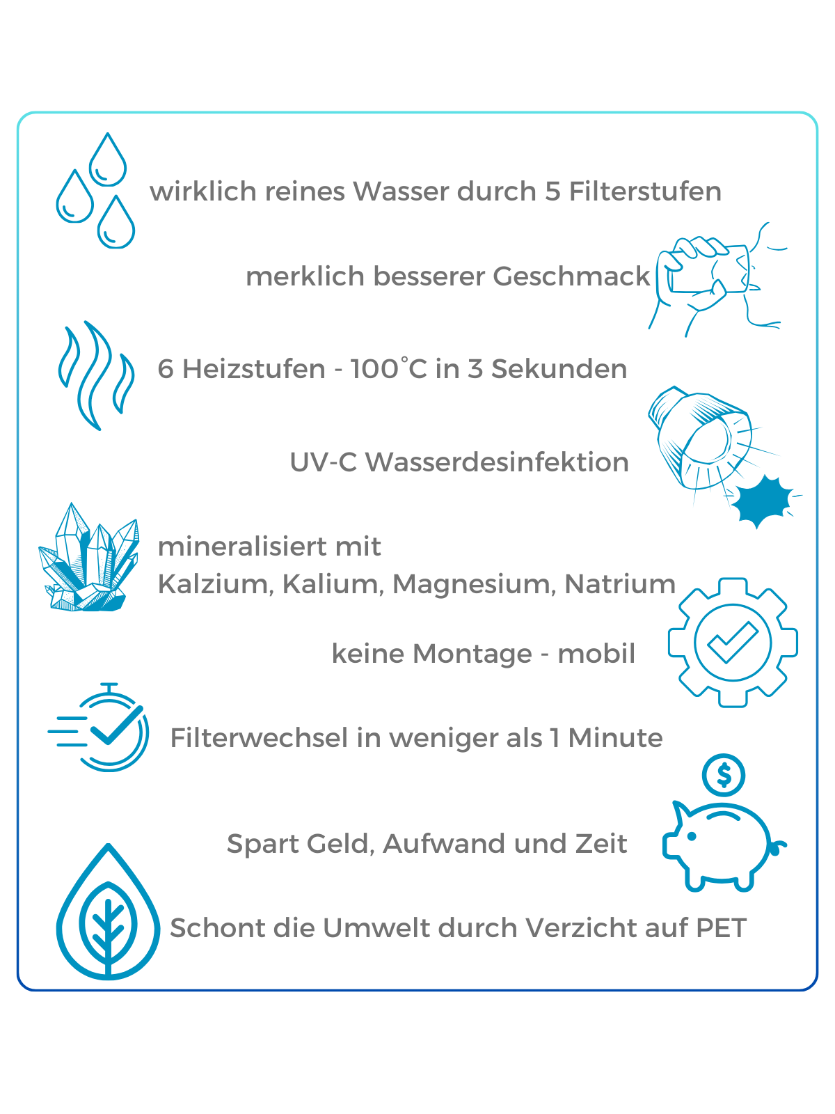 | Zertifizierung | CE, RoHS, NSF/ANSI (Filtermaterial) |